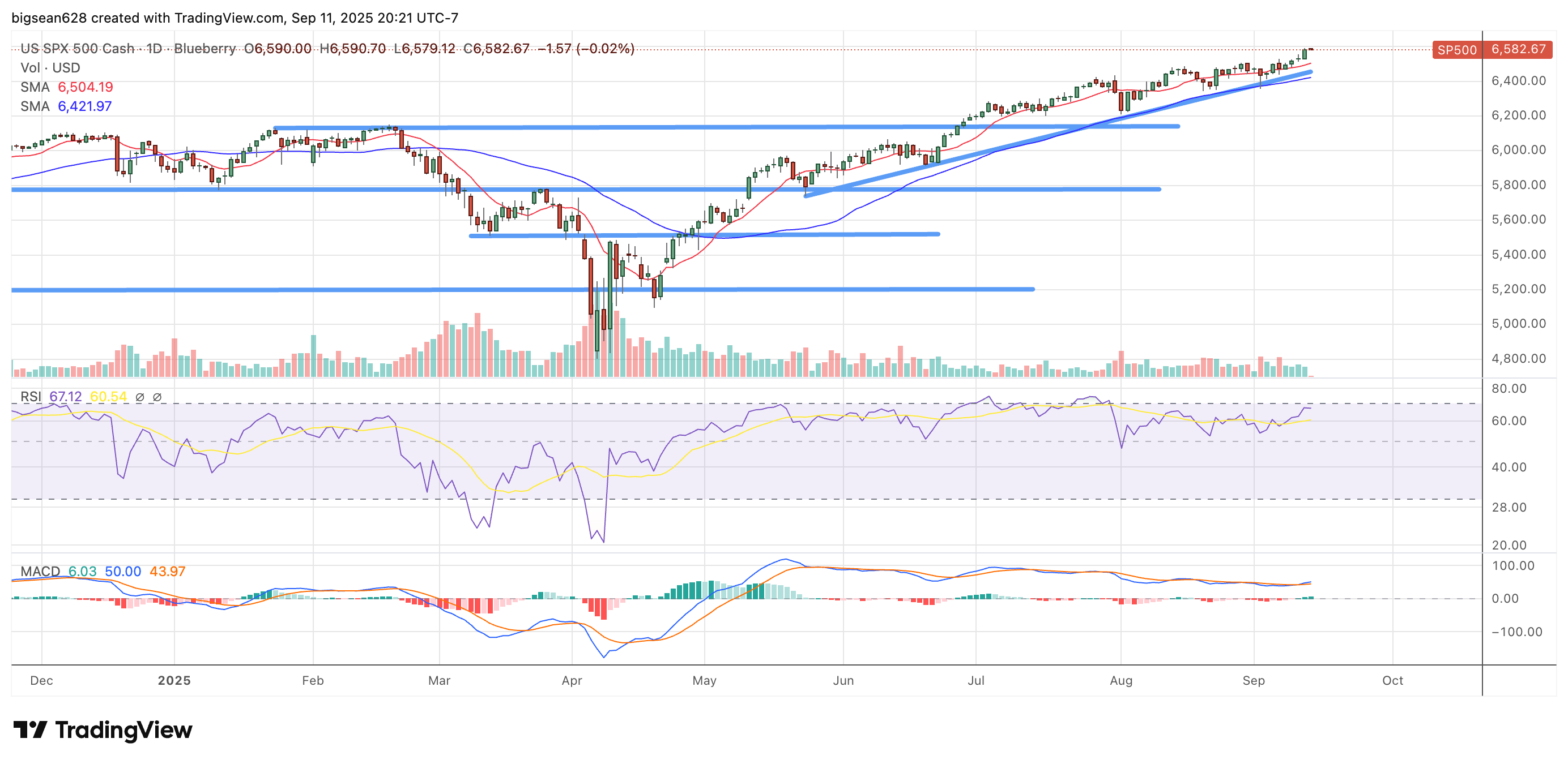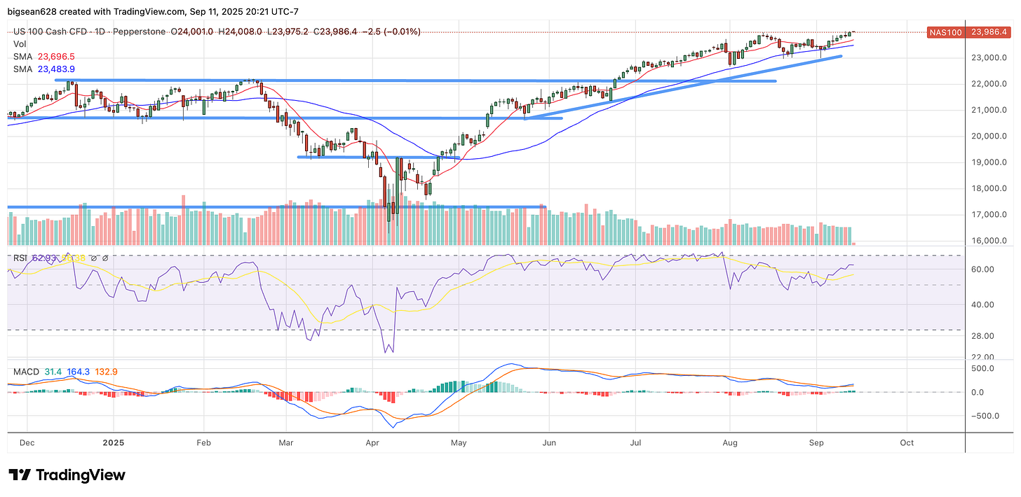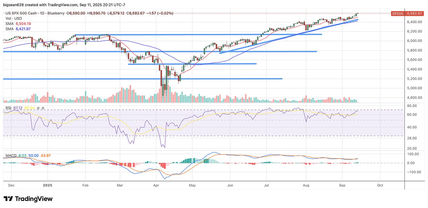 Market surges as inline CPI and rising jobless claims confirm expectations for swift rate cuts. The shift toward cyclicals signals optimism, reflecting an early-cycle recovery narrative rather than recession fears. Overbought technicals and elevated valuations position AI infrastructure plays as a funding source during this rotation. We maintain an overweight stance on cyclicals heading into Q4 but beware of a post FOMC pullback.
